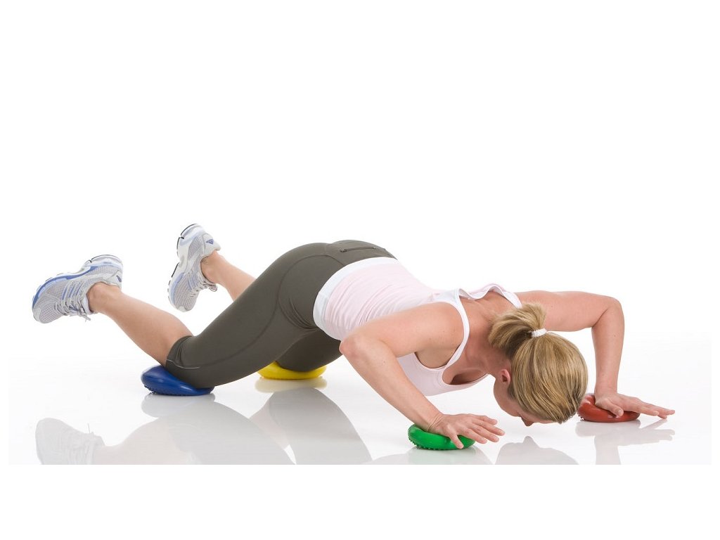 V balení jsou 4 balanční podložky - červená, modrá, zelená a žlutá.