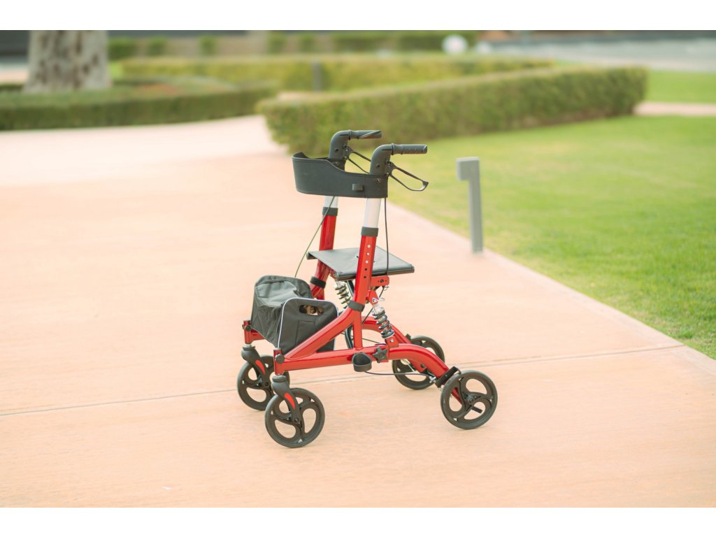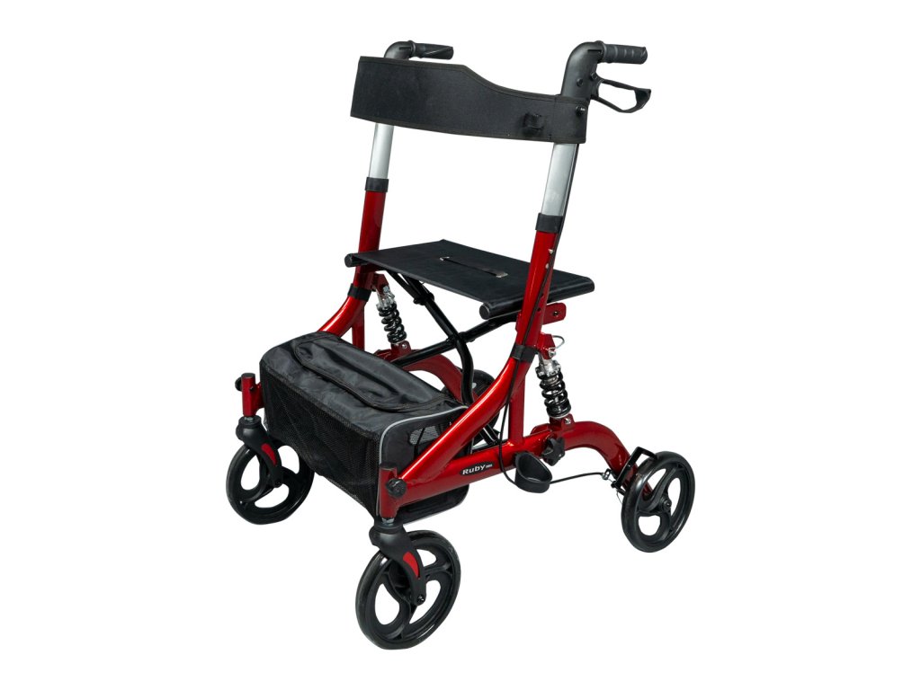 Chodítko s koly RUBY je skládací hliníkové rolátor s odpružením, sedátkem, úložnou brašnou a držákem na hůl, určený pro vnitřní i venkovní použití. Má velká 8" plná kola, nastavitelnou výšku rukojetí a brzdy s aretací, což zajišťuje maximální bezpečnost a komfort. Vhodné pro seniory a osoby s omezenou pohyblivostí. Nosnost až 136 kg.