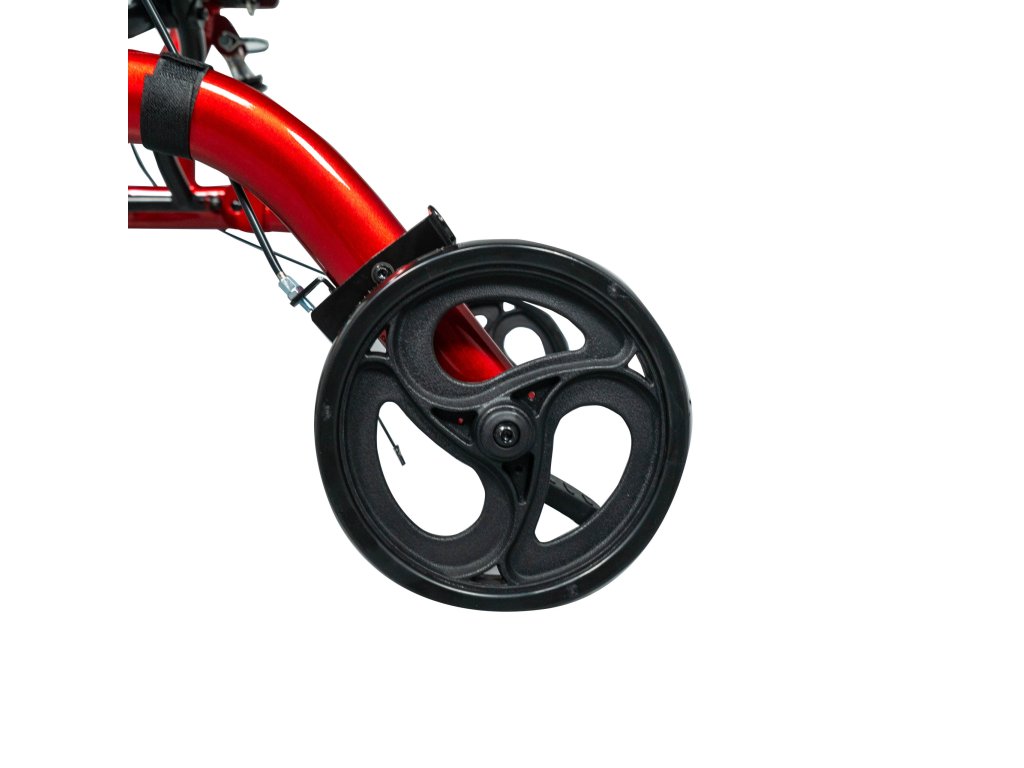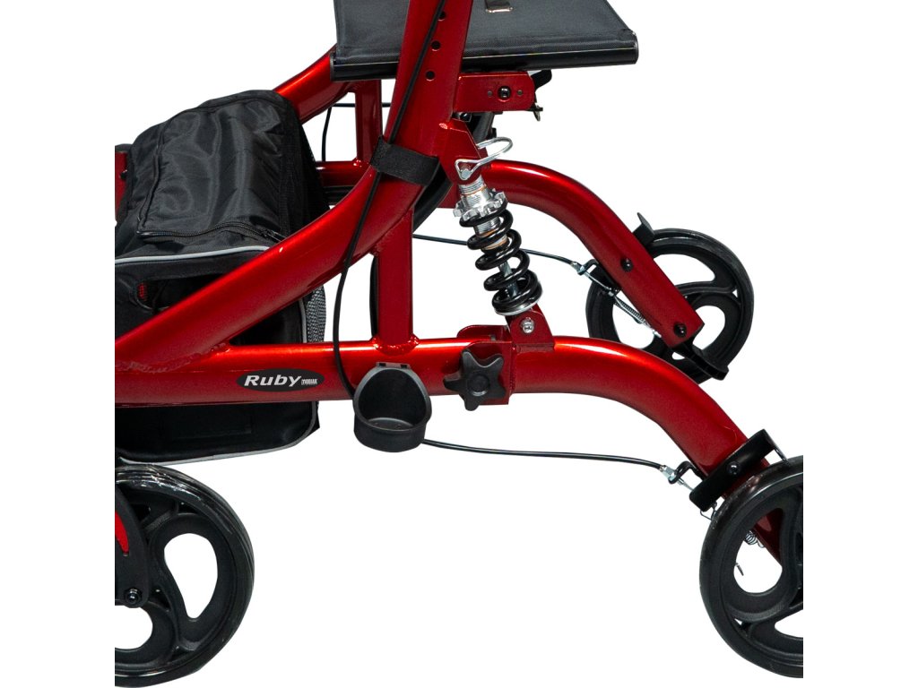 RUBY je kvalitní čtyřkolové chodítko s hliníkovým rámem, navržené pro bezpečný a pohodlný pohyb doma i venku. Díky odpružení poskytuje vyšší stabilitu na nerovném povrchu a tlumí nárazy, což výrazně zvyšuje komfort při chůzi, zvláště při použití venku. Velká 8" kola zajišťují plynulé tlačení a snadnější překonávání obrubníků i nerovností.