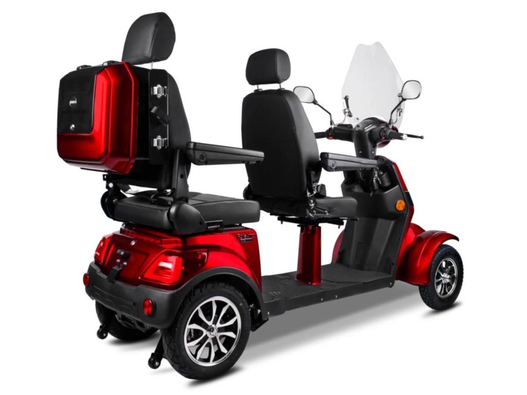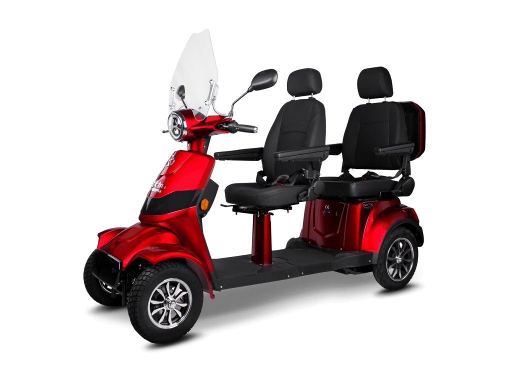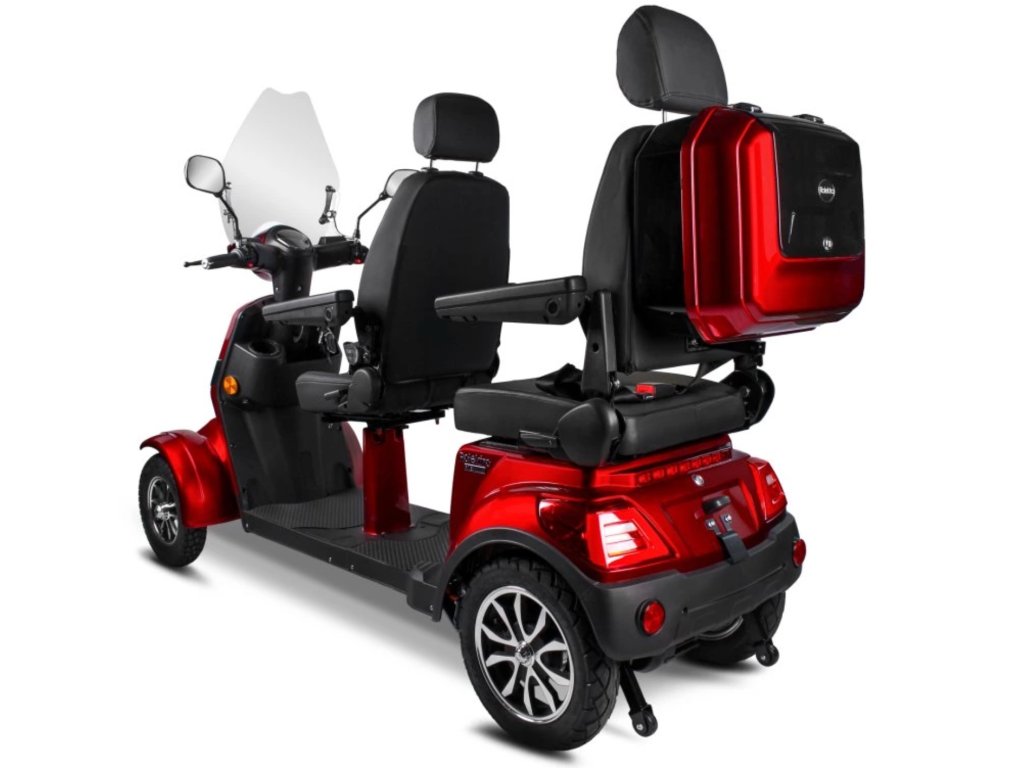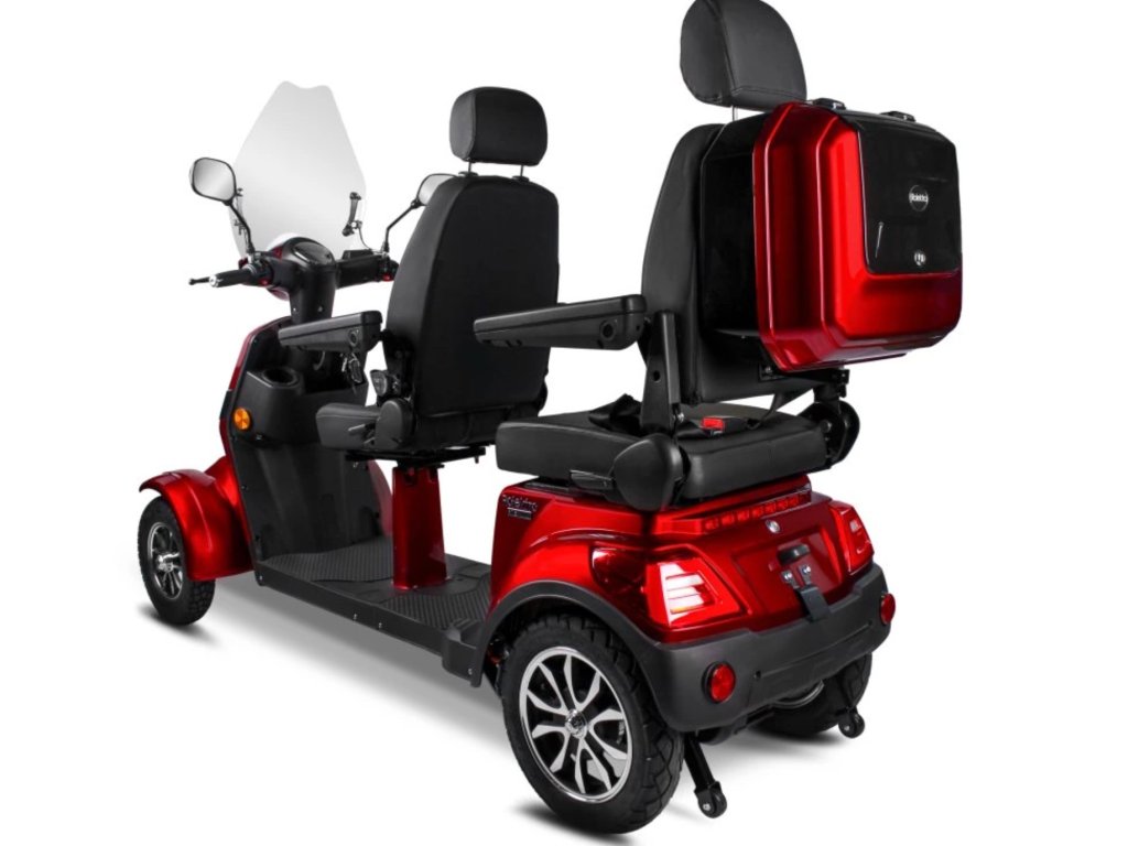 E-Quad 25 Duo je komfortní elektrická čtyřkolka pro seniory i aktivní uživatele, ideální pro městské cesty i krátké výlety do přírody. Nabízí výkonný 1500W motor, dojezd až 65 km, maximální rychlost 25 km/h a intuitivní ovládání díky automatické převodovce. Díky LED osvětlení s certifikací E-Mark, bezpečnostnímu pásu, parkovací brzdě a robustnímu rámu je bezpečná a stabilní. Praktické doplňky jako USB nabíječka, alarm proti krádeži, čelní sklo a úložný kufr dělají z této čtyřkolky ideální prostředek pro každodenní mobilitu.