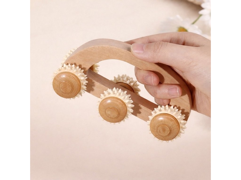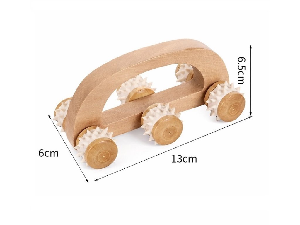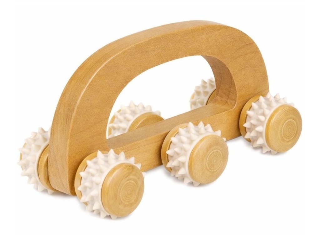 Dřevěný masážní váleček s ergonomickým úchytem a 6 kolečky s drobnými hroty pro účinné uvolnění svalů a podporu prokrvení celého těla.