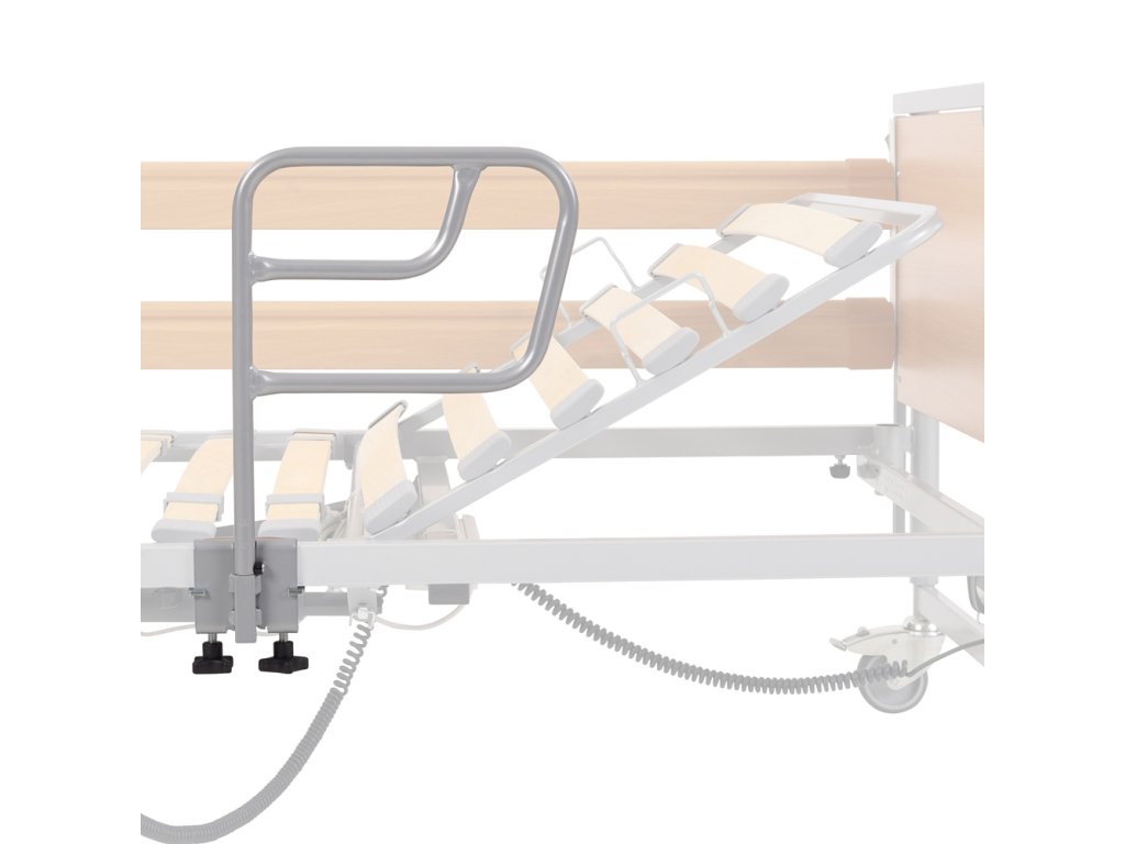 Díky otočné aretaci a možnosti odpojení se madlo snadno přizpůsobí prostoru a uživatelské situaci. Funguje jako diskrétní opora pro vstávání, zároveň nezabírá při manipulaci s lůžkem. Madlo je určeno pro použití bez nutnosti demontáže postrannice lůžka, což zvyšuje komfort a praktičnost.