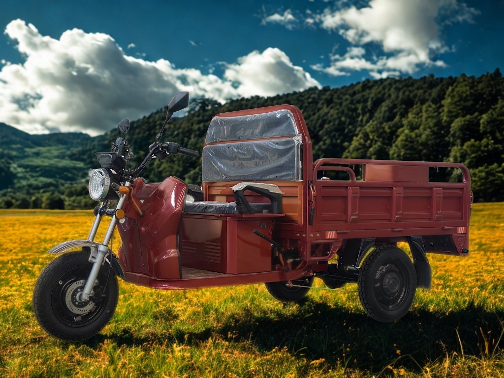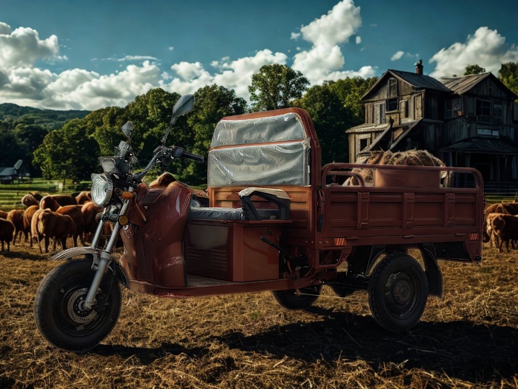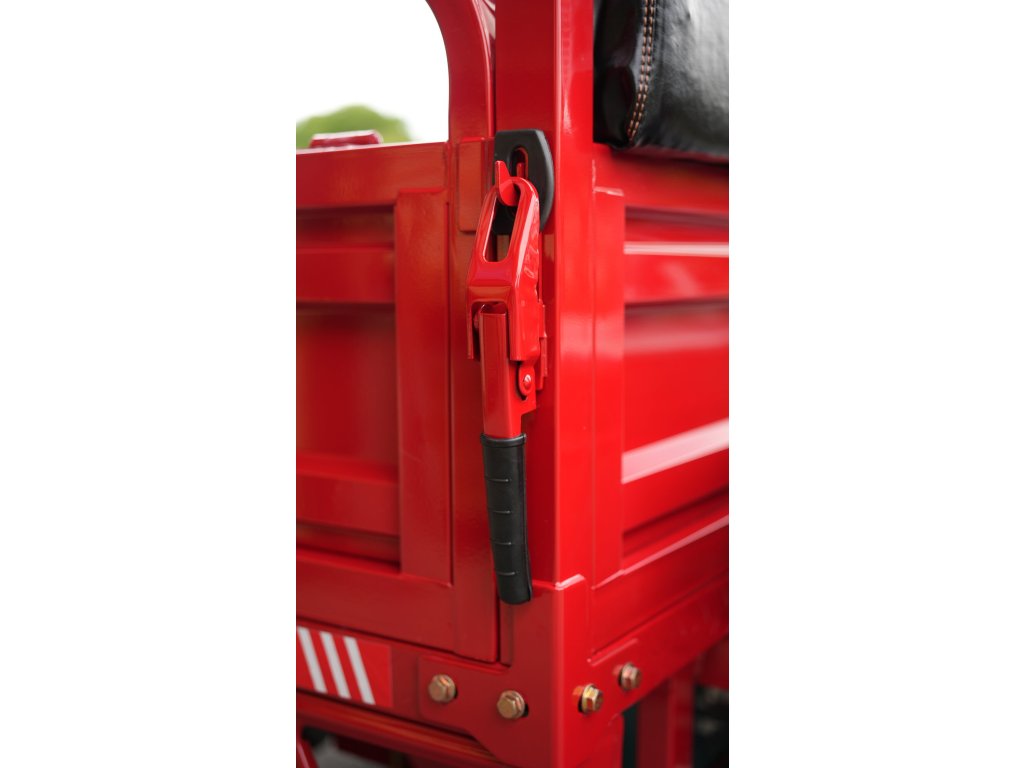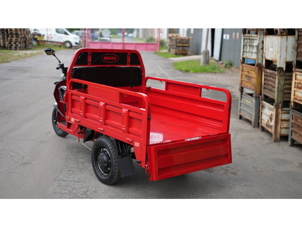 Díky výkonnému 2800W motoru a trvalému převodu zvládne jízdu do prudkého kopce i s plným nákladem. Ložná plocha 1500 × 1100 mm unese až 450 kg, a díky ručnímu sklápění s pneumatickou vzpěrou se snadno vykládá. Tříkolka je vybavena odolným podvozkem s listovým odpružením vzadu a vícestupňovým moto tlumičem vpředu.