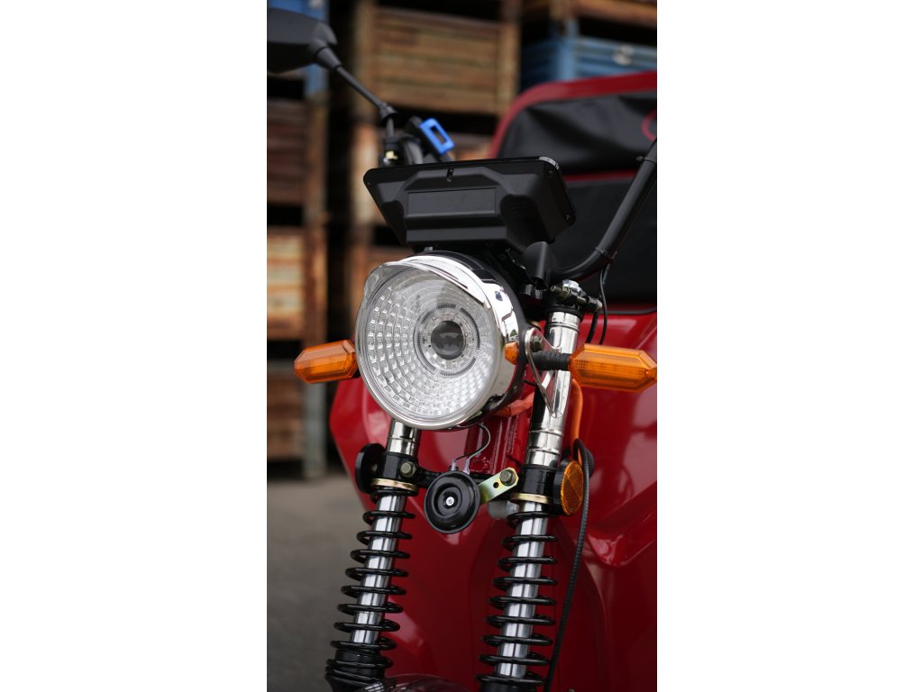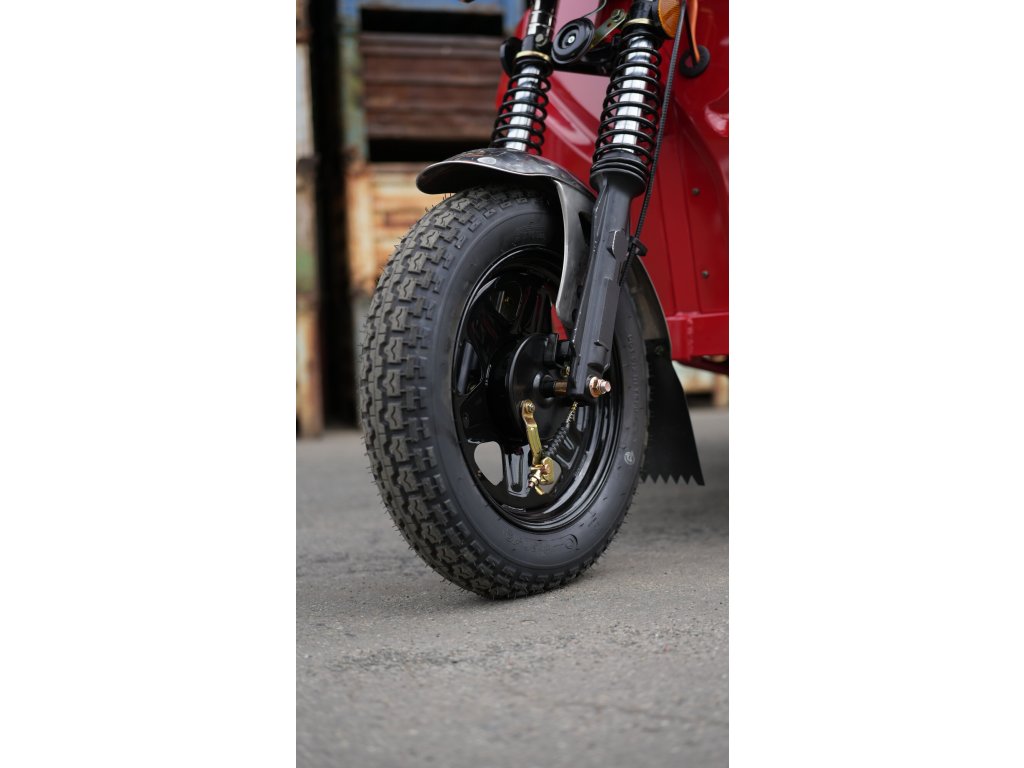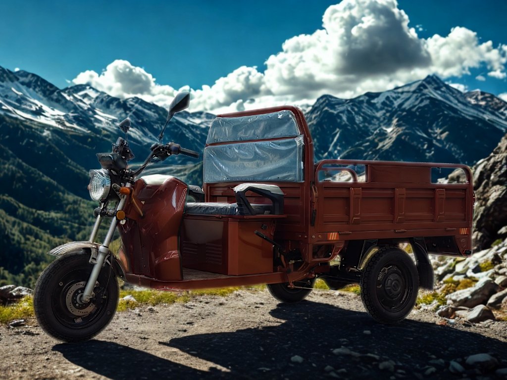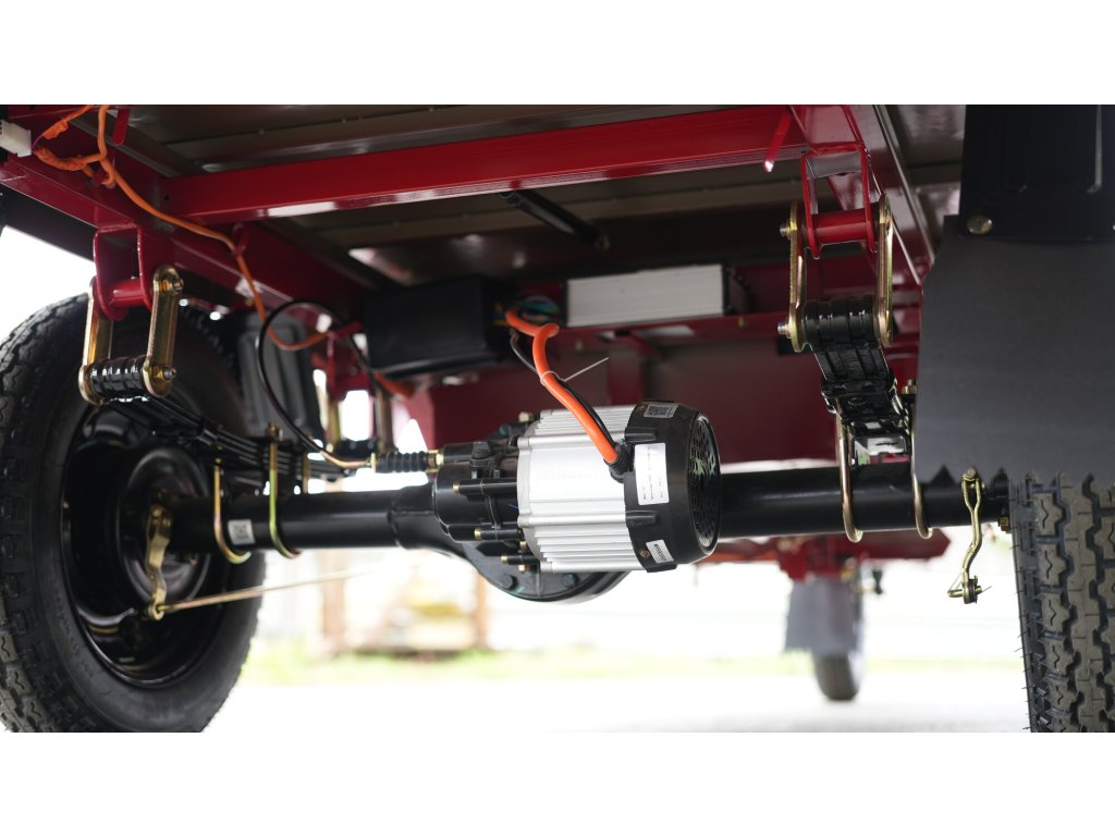 Díky výkonnému 2800W motoru a trvalému převodu zvládne jízdu do prudkého kopce i s plným nákladem. Ložná plocha 1500 × 1100 mm unese až 450 kg, a díky ručnímu sklápění s pneumatickou vzpěrou se snadno vykládá. Tříkolka je vybavena odolným podvozkem s listovým odpružením vzadu a vícestupňovým moto tlumičem vpředu.