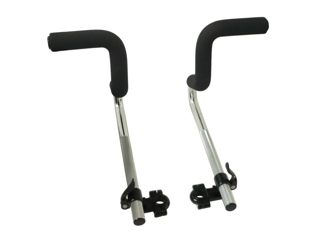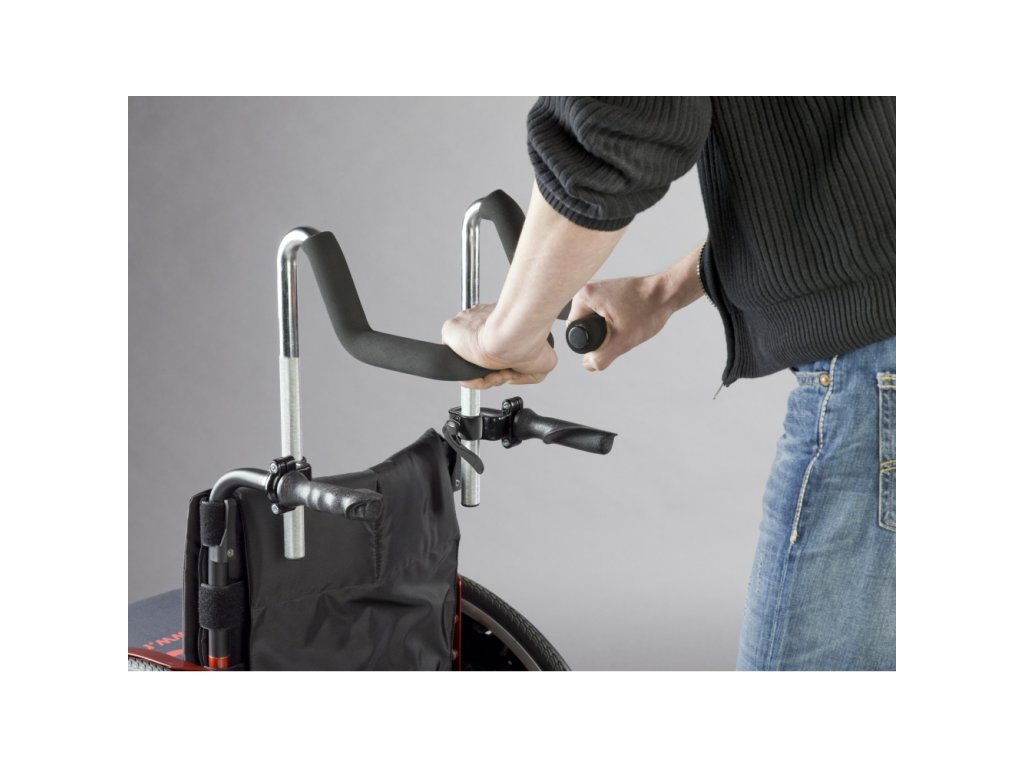 Přídavná tlačná madla pro mechanické vozíky z ocelové chromové konstrukce. Umožňují výškové nastavení 25 cm nad stávající madla a orientaci kolmo na směr jízdy vozíku, což zajišťuje pohodlné tlačení. Madla umožňují vyvinout vyšší sílu a lze je instalovat na trubky zádové opěrky o průměru 22–25 mm. Ideální volba pro snadnější a ergonomičtější manipulaci s mechanickým vozíkem.