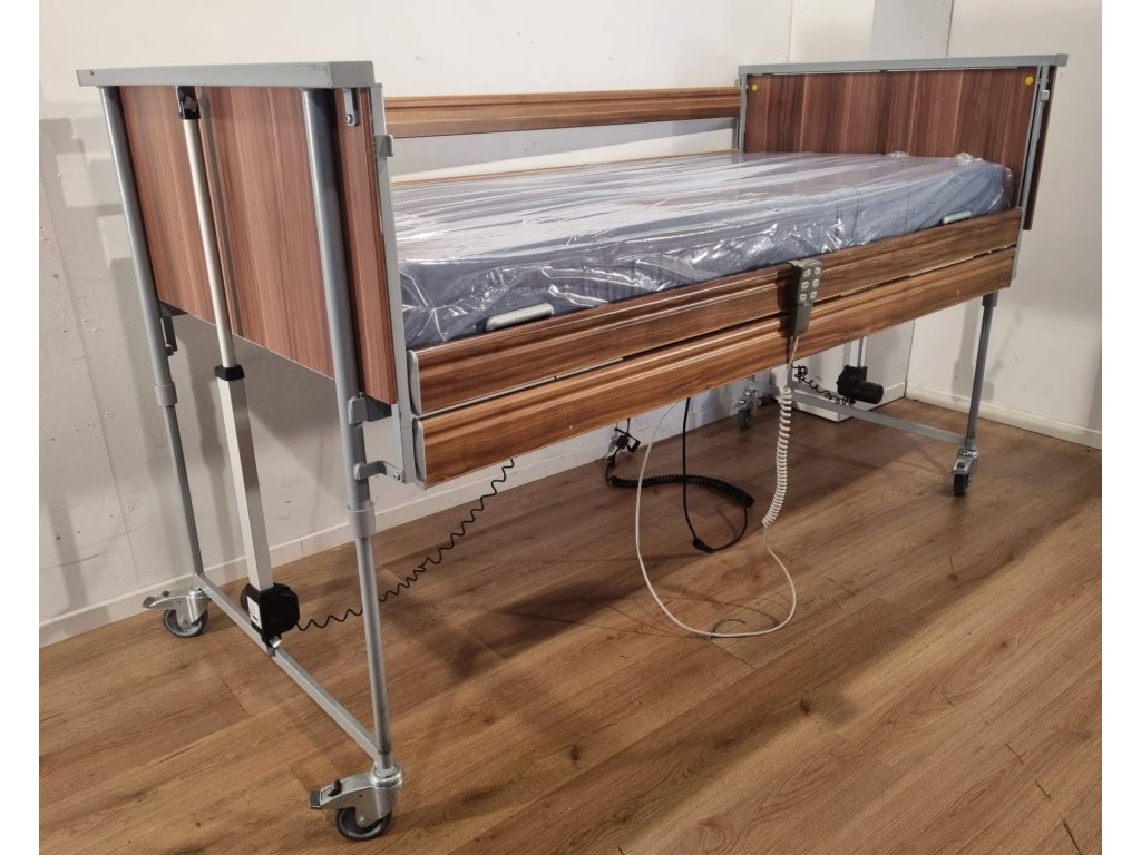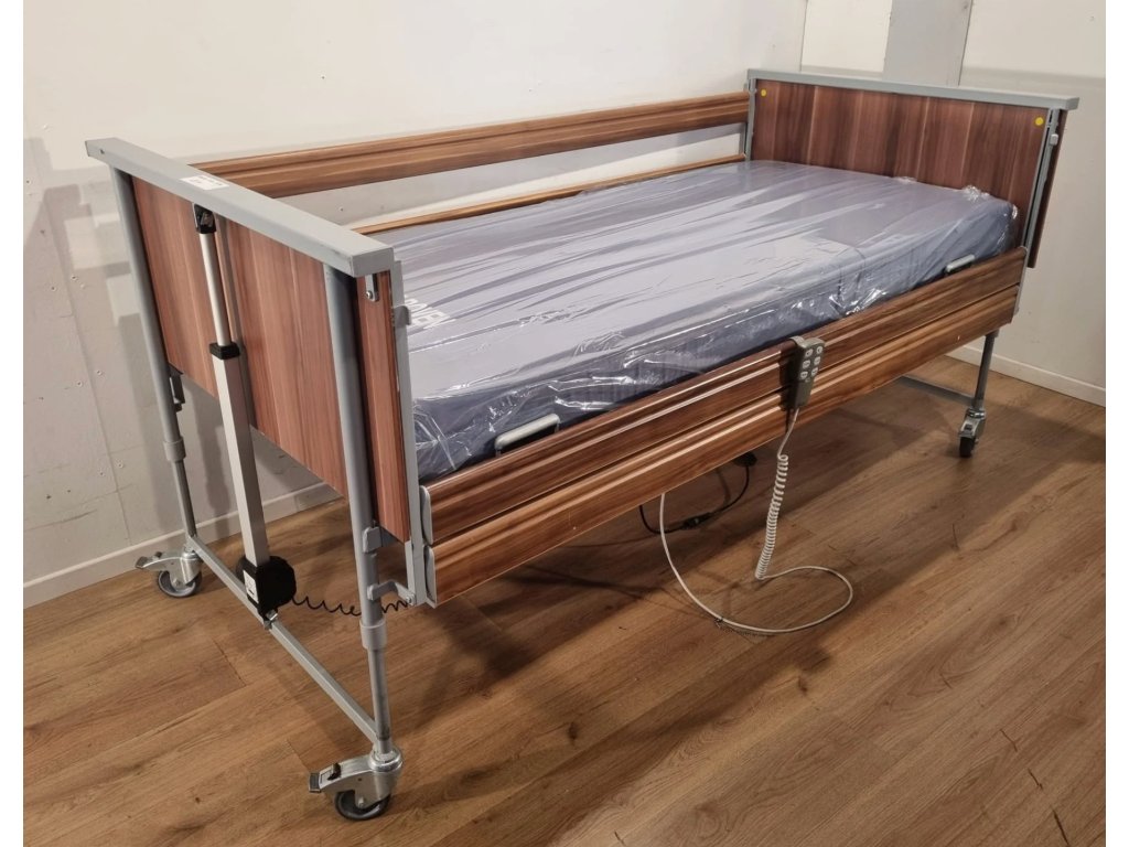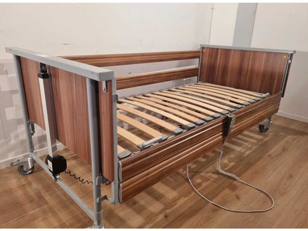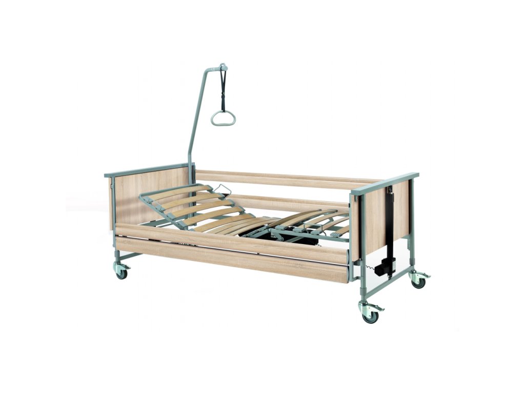 Polohovací lůžko – Elektrické DOMIFLEX nabízí čtyřdílný lamelový rošt s možností samostatného nastavení hlavy, sedáku, stehen i lýtek. Nízkoproudové lineární motory umožňují snadné ovládání poloh, výška ložné plochy je variabilní (45–95 cm), kovový rám s dřevěnými čely, bezpečnostními bočnicemi. Ideální pro domácí péči. Částečně hrazeno pojišťovnou.