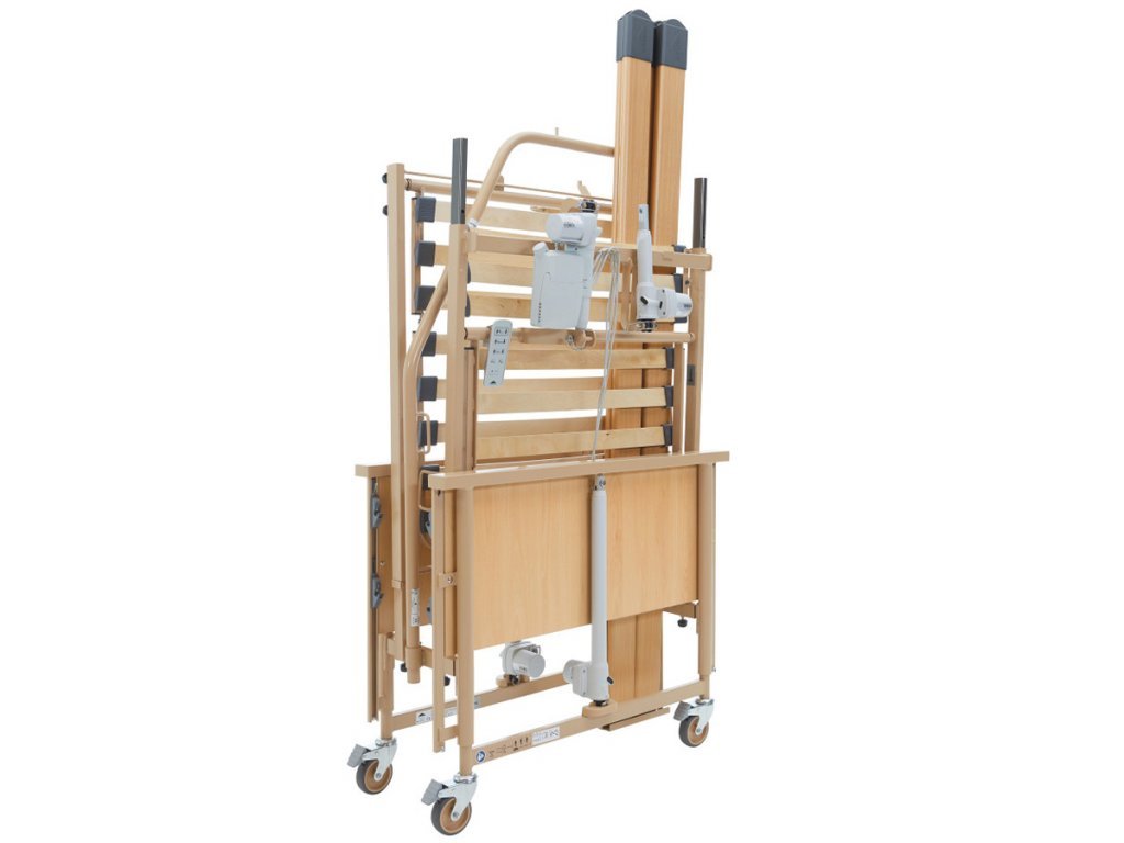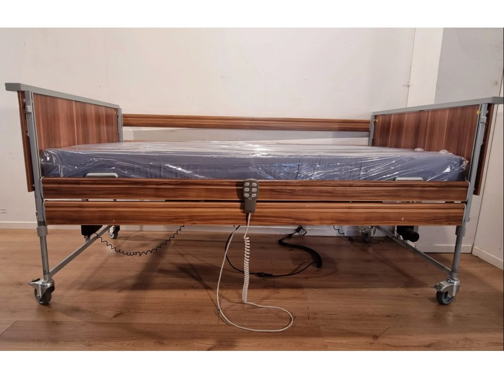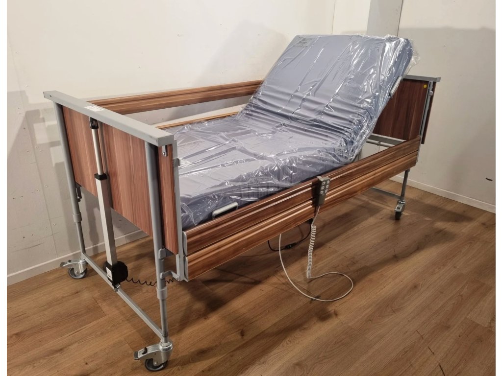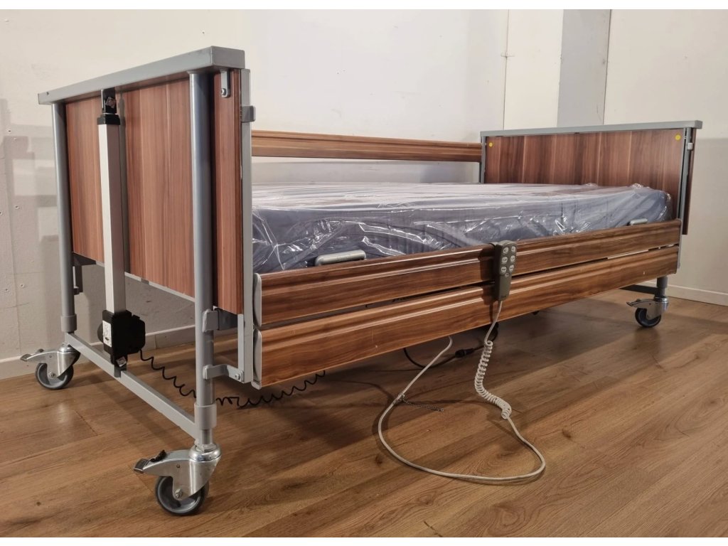 Polohovací lůžko – Elektrické DOMIFLEX nabízí čtyřdílný lamelový rošt s možností samostatného nastavení hlavy, sedáku, stehen i lýtek. Nízkoproudové lineární motory umožňují snadné ovládání poloh, výška ložné plochy je variabilní (45–95 cm), kovový rám s dřevěnými čely, bezpečnostními bočnicemi. Ideální pro domácí péči. Částečně hrazeno pojišťovnou.